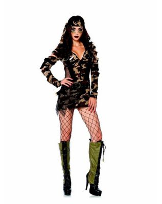 Show everyone how it's done in this camouflage long sleeve dress with net overlay and matching headband.Combat Babe Dress Adult Women's Costume includes: Dress (zipper closure) Belt Headband Boots and pantyhose not included Materials:Dress- 96% PolyesterBody- 4% SpandexMesh- 100% Polyester Wash/Care Instructions: Hand wash coldOnly non-chlorine bleach when neededLine dryDo not iron