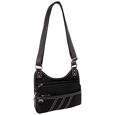This multi-zip bag in black is made from high quality pebble grain faux leather for durability The strap can be adjusted as per your comfort and style Measuring 8.5 (h) x 10 (w) x 1.5 (d) , this crossbody bag is small in size and easy to carry around