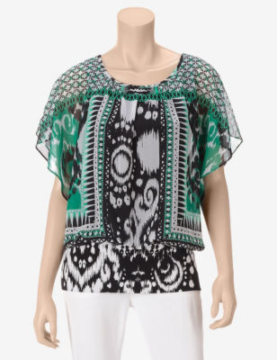 Dolman cap-sleeves Scoop neckline Shirred yoke Banded hem Blouson body Green, white and black tribal ikat print chiffon top 100% polyester Machine washable Imported