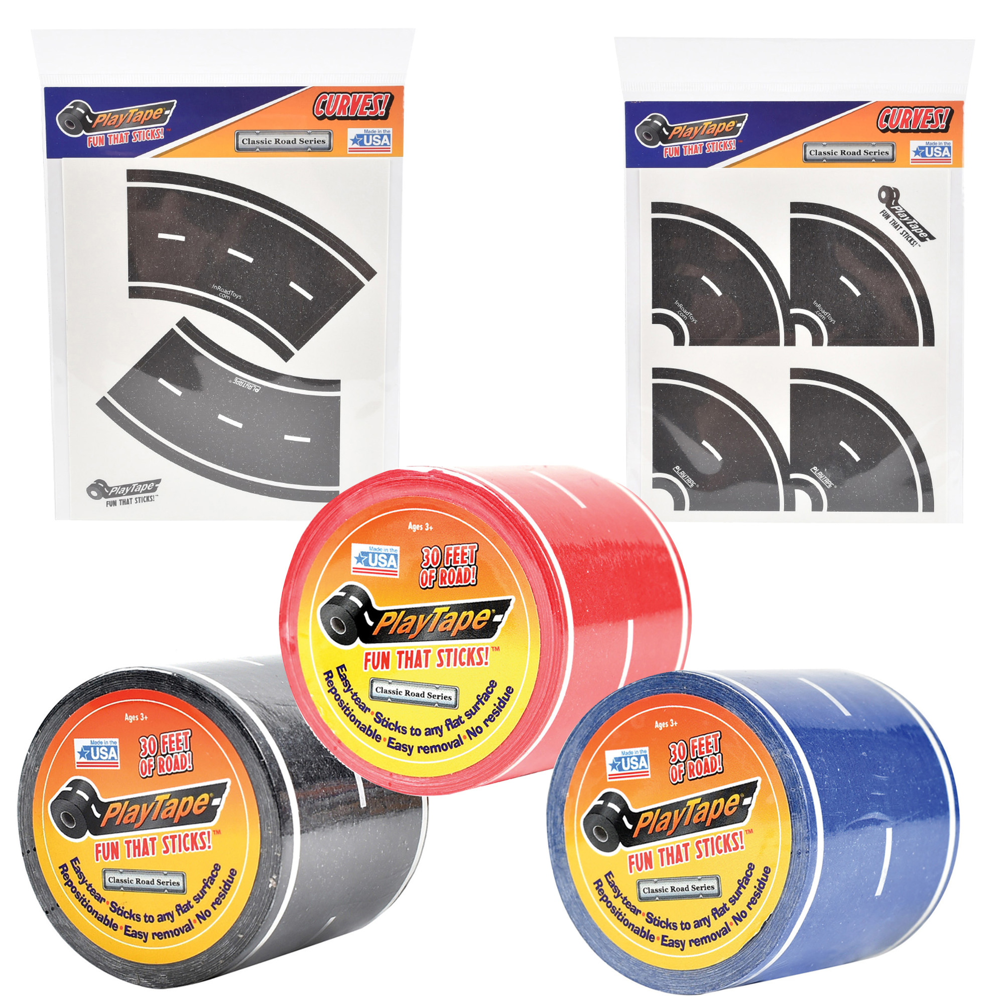 These are related products PlayTape Classic Road Series Bundle 30 ft x 2 in Black Blue and Red Road with 8 Tight Curves and 4 Broad Curves, it will probably be your best choice as well.